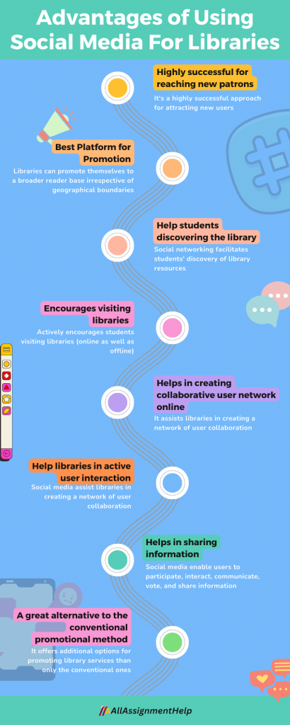 - Through social media, libraries can promote themselves to a broader reader base irrespective of geographical boundaries