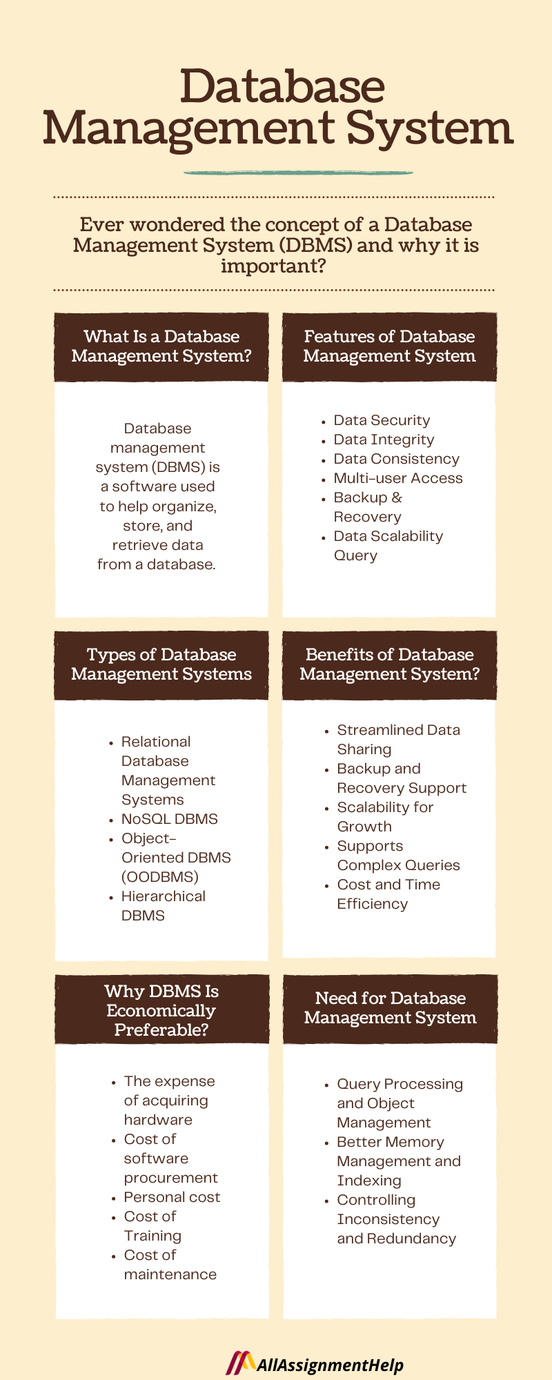 Ever wondered the concept of a Database Management System (DBMS) and why it is important? They are undoubtedly vital for many companies, major sectors, and even governments. The database management system is the system software used to create and administer databases. Now, we can say a Database is a place where a similar type of information is cached and a variety of operations can be executed on it. Students who have a course in Database Management should know the fundamentals of this subject. In this blog of All Assignment Help, we will discuss everything about DBMS from its definition to features and Benefits of Database Management Systems. Keep reading the blog till the end and now everything there is you need to know about DBMS.