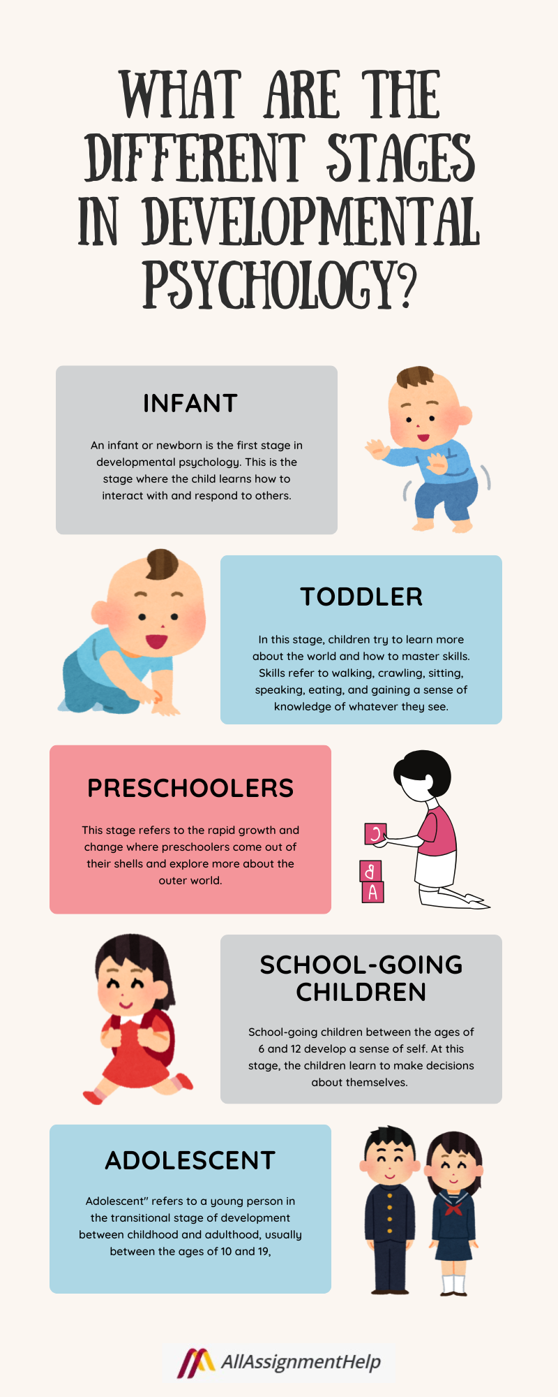 There are five stages in this developmental psychology. They are infants, toddlers, preschoolers, school-age children, and adolescents. Below, we will take a quick look at these stages and the insights they offer about human development and evolution.