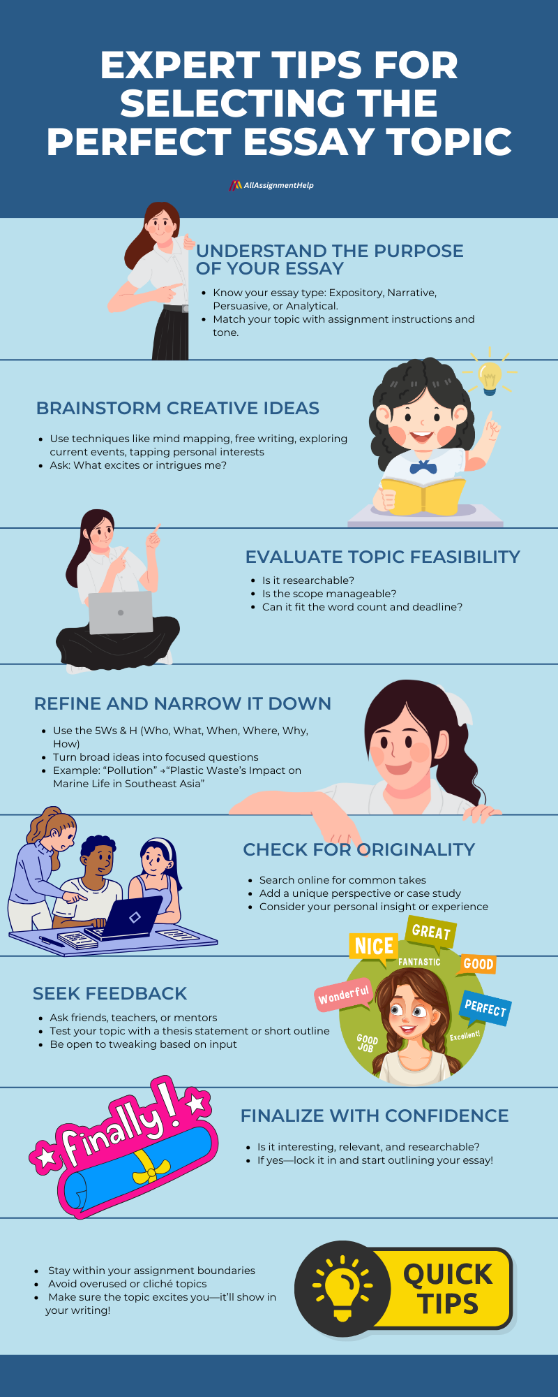 In this blog by All Assignment Help, we will dive into the perfect essay topics. One that is interesting, easy to research, and unique, along with some expert tips on how to choose the best essay topic. With these strategies, you can select a topic that will write your essay on a solid foundation.