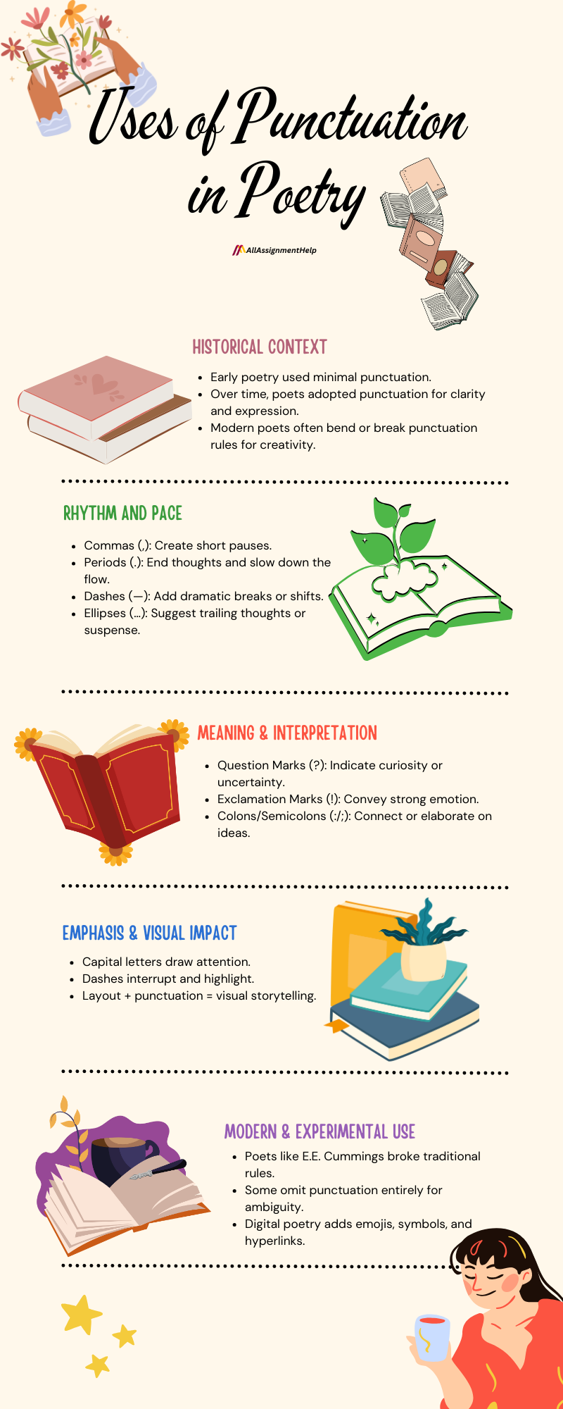 Additionally, punctuation is not a set of rules to be followed in poetry; it is a tool for expression. From the purposeful halt introduced by a comma to the jarring cut of an exclamation mark, punctuation can take an ordinary phrase and turn it into something dense with feeling and subtlety. Considering the purpose and effect of punctuation in poetry expands our understanding of the poet’s craft and enriches the reading experience. In this blog by All Assignment Help, we will delve into the different uses of punctuation in poetry, from how it has evolved over the years to how experimental poets of today are reworking it.