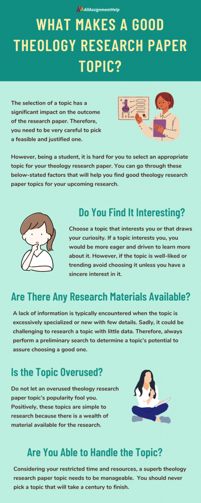 Furthermore, make sure the topic has a theoretical foundation. In addition, the topic should seek to fill a particular knowledge gap or offer answers to a particular problem. However, being a student, it is hard for you to select an appropriate topic for your theology research paper. You can go through these below-stated factors that will help you find good theology research paper topics for your upcoming research.