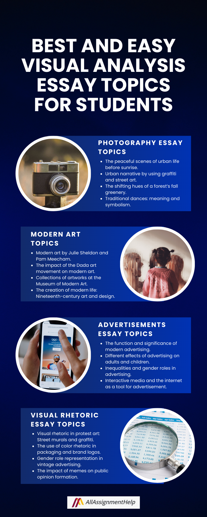 In this blog post of All Assignment Help, we have curated a list of some of the best visual analysis essay topics for students and steps to structure a visual analysis essay. Also, we have provided easy ways to select a topic for your essay so that you can submit a presentable essay on a captivating topic.