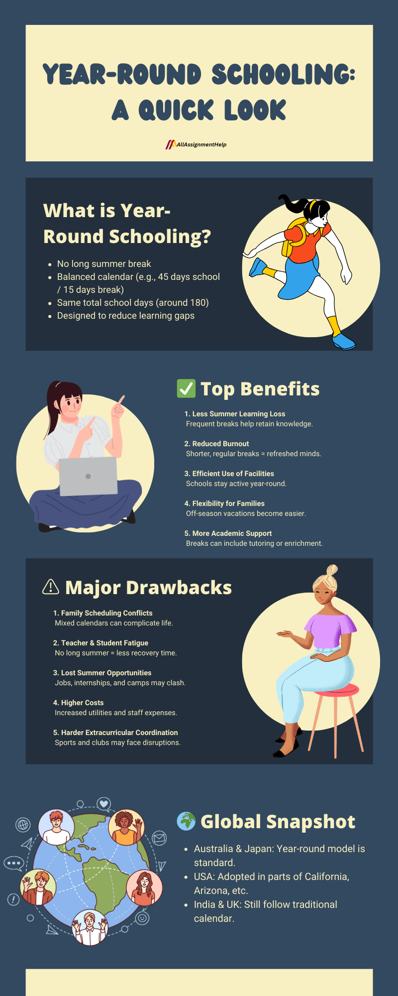 In this blog by All Assignment Help, we are exploring the advantages and disadvantages of year-round schooling. Are you a curious parent, an overworked teacher, or simply someone who believes August should always mean vacation? This one is for you. Let us break it down: the facts and feelings, the future of school without a long summer snooze.