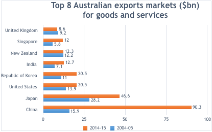 The bar chart to compare the value of Australian top 8 Export markets in 2004-05 and 2014-15 is shown below: