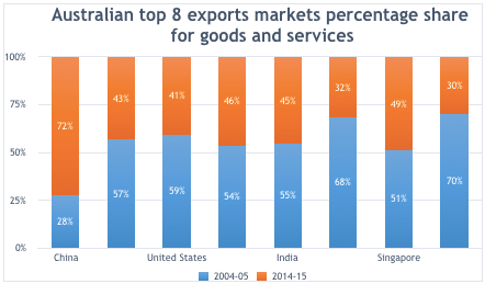 - According to the charts obtained in part (b) the percentage share value for China increases by 25% and decreases for the rest of the seven countries from year 2004-05 to 2014-15. The exports increases in china by 82%, Singapore by 52%, Republic of Korea by 46%, India by 44%, Japan by 39%, United States by 32% and decreases in United kingdom by 7% from year 2004-05 to 2014-15.