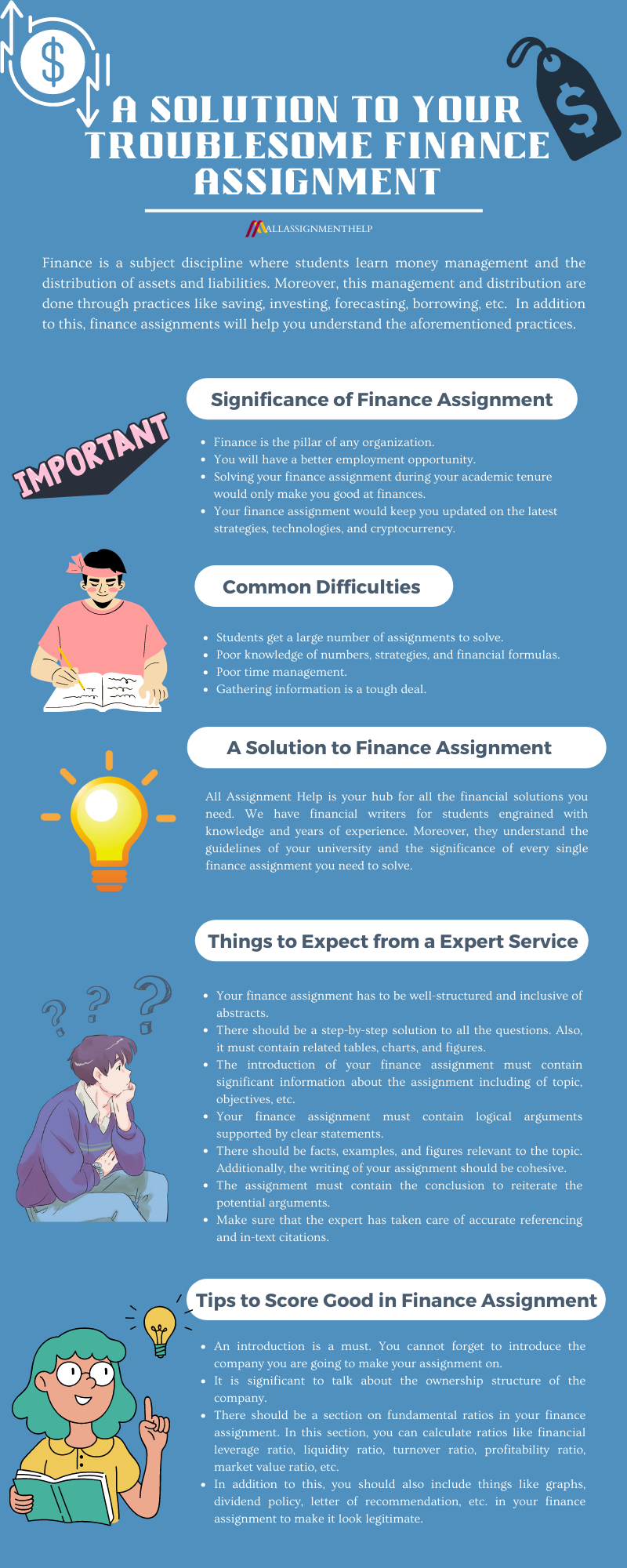 - Regardless of the field, you choose to study be it advertising, business, or anything, finance is the pillar of any organization. Hence, you need to understand the significance which is possible if you solve as many finance assignments as you can.