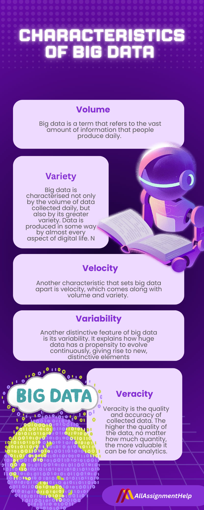 Big data is characterised not only by the volume of data collected daily, but also by its greater variety. Data is produced in some way by almost every aspect of digital life. Nowadays, almost every aspect of life is monitored and saved, from videos and posts on social media to customer information and medical records. Furthermore, data can be classified as unstructured, semi-structured, or structured. Whereas unstructured data is disorganised, akin to a deluge of images or films, structured data is a collection of organised data. In the middle is semi-structured data, which has categorising features but no strict framework.