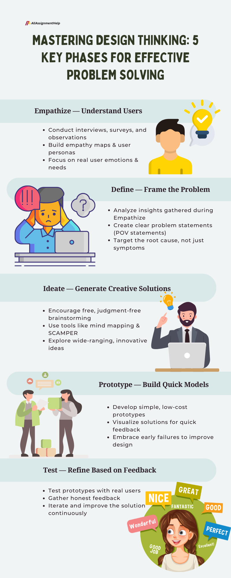 In an increasingly fast-paced world, problems need more than quick fixes. They need an approach that is thoughtful and user-centred. Design thinking provides precisely that. It combines creativity, logic, and empathy to solve problems in novel ways. Whether you are building a product, refining your service, or tackling the complexities of enterprise business challenges, design thinking enables you to understand those you are solving for. This blog by All Assignment Help will guide you through the 5 phases of design thinking – empathise, define, ideate, prototype, and test. We will also learn how to master each one to implement successful, long-term solutions.