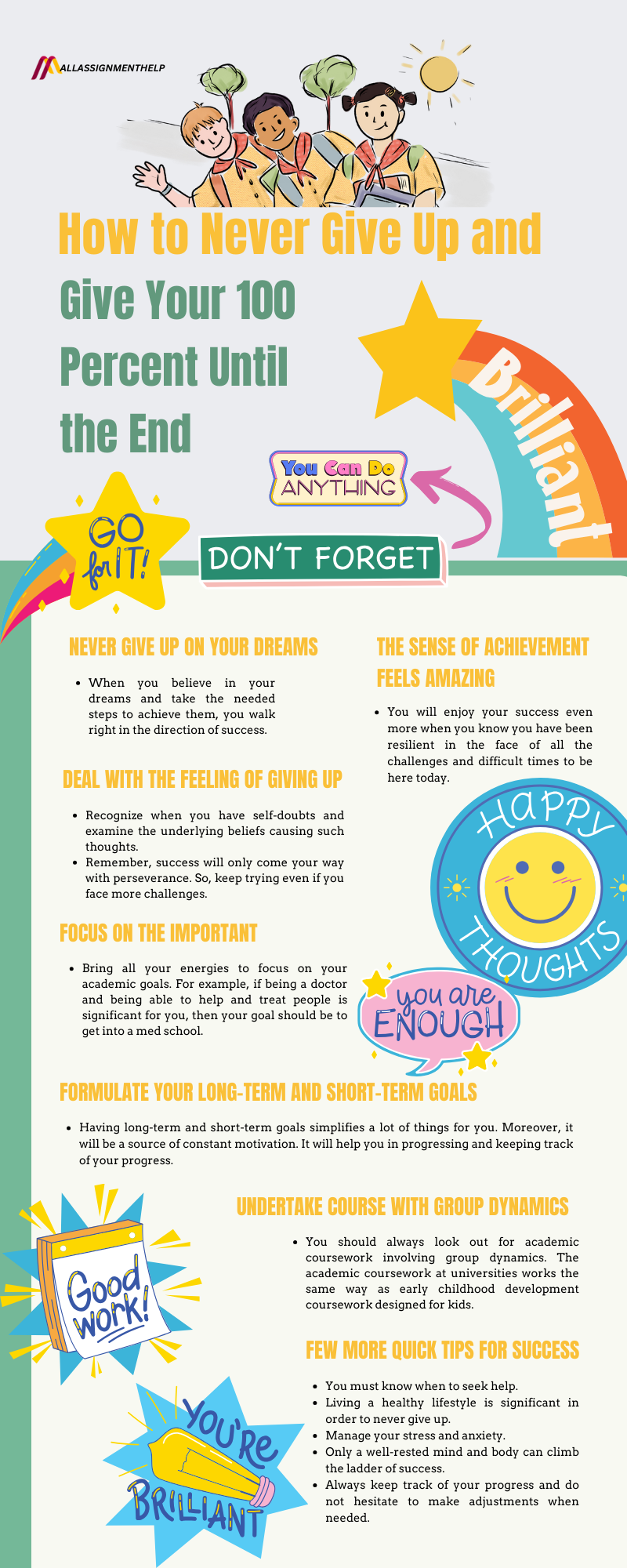 Can you imagine the feeling you will get when you score an A on your exam? It feels stupendous right? Alongside this, your self-confidence will be on cloud nine. Hence, to experience how it feels to achieve your academic goal, you should never give up. What’s interesting is that you will enjoy your success even more when you know you have been resilient in the face of all the challenges and difficult times to be here today.